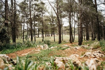 Thin trees and green grass growing on stony ground on clearing in calm forest