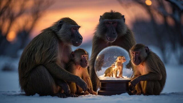 A group of baboons gathered around a snow globe depicting a baby baboon in a snowy setting.