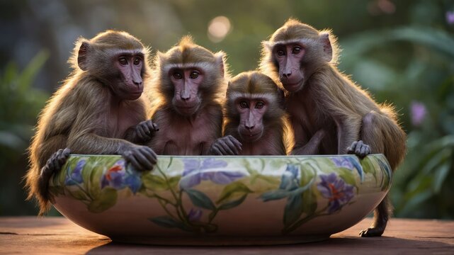 Four baboons gathered around a decorative bowl, enjoying a serene moment in a lush garden