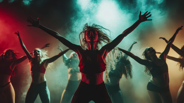 Dancing active women engaged in a group class practice energetic dance in a modern dance studio