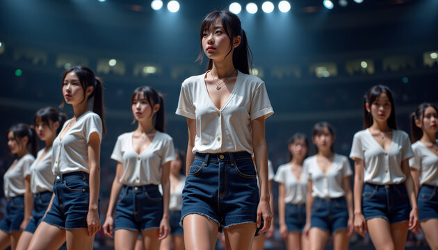Japanese girls dance group performance in sports center or concert hall. Asian women crew performing on show stage, theater, high school or university.