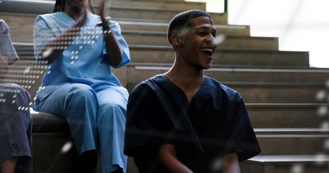 Laughing male nurse in navy scrubs sitting on clinic steps with clapping colleagues