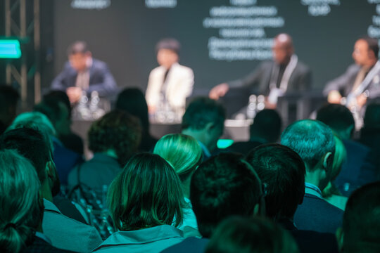 Crowd of professionals attending business conference, focusing on speakers in panel discussion. Engaged audience listens attentively to industry leaders sharing insights.