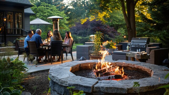 A unique firepit design featuring a built-in grill, with a group of friends enjoying a barbecue and the warmth of the fire on a cool evening