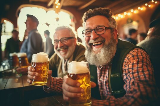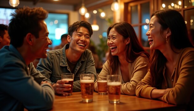 A group of cheerful friends are having a great time together at a pub, laughing and enjoying their drinks. The image captures the joy of friendship and socializing over a few beers.