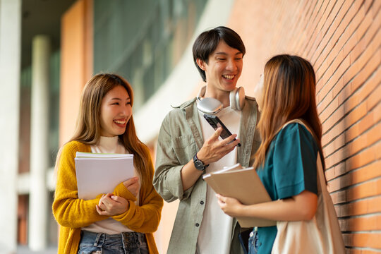 Students at university with fun for learning,Walking,laughing and bonding and talking.asian group of gen z friends student giving high five outdoor with books ready for education at college campus.