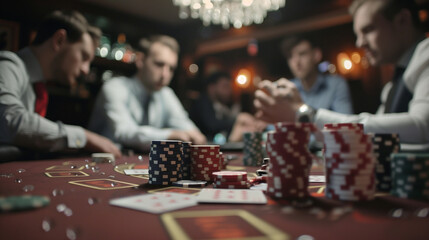 a group of men at a bachelor party playing poker in a private lounge, with stacks of chips and cards on the table
