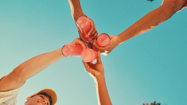 Celebrating summer with friends toasting beach drinks