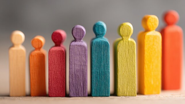 Diverse group of wooden people representing equity in access chart and bar graph measuring community inclusion