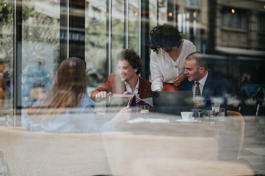 2 businesswomen working on line watching webs in a laptop in a bar with a window and and outdoors in the background