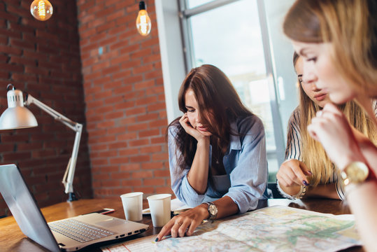 Group of young people gathered around desk in classroom, discussing project and analyzing documents. Happy university students collaborating, using laptop and sharing ideas during educational teamwork