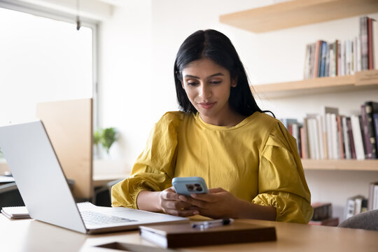 Inspired with innovations. Confident millennial student girl manage diverse modern tech gadgets in research work at library use cell task manager app text message to groupmate distracted from notebook