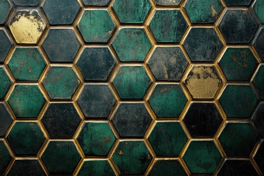 Hexagonal tiles in teal and gold.  Detailed close-up view of repeating teal and gold hexagonal shapes, with dark grout lines.  Textured surface with subtle variations in color and tone