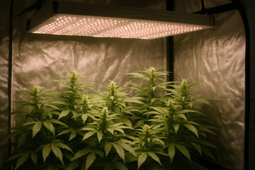 Indoor cannabis plants thriving under led grow lights in reflective grow tent