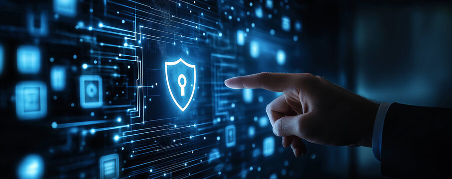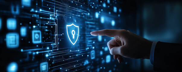 Cybersecurity and privacy concepts to protect data. Lock icon and internet network security technology, Businessman protecting personal data on smartphone, Virtual screen interfaces, cyber security.