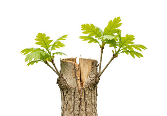 Oak tree stump with new growth isolated on transparent PNG, symbol of resilience and hope for nature conservation projects