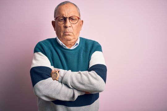 Senior handsome man wearing casual sweater and glasses over isolated pink background skeptic and nervous, disapproving expression on face with crossed arms. Negative person.