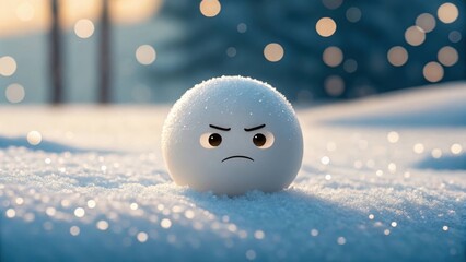 An angry snowball with a grumpy face sits on a snowdrift in a winter landscape with bokeh lights