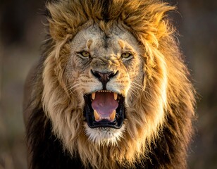 Close-up of a large male feline roaring, revealing teeth and a powerful mane. The creature's expression is fierce and intimidating