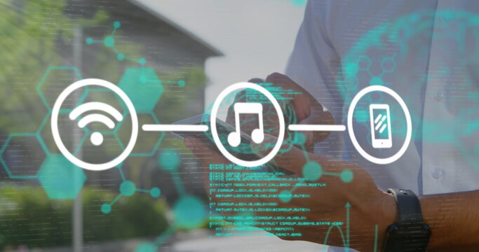 Image of scientific data and tech icons over hands of caucasian man using smartphone