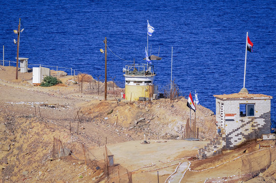 Guard posts on the border between Israel and Egypt seen from Taba resort town, Egypt