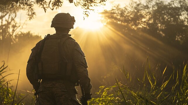 Soldier standing guard observing sunrise through trees