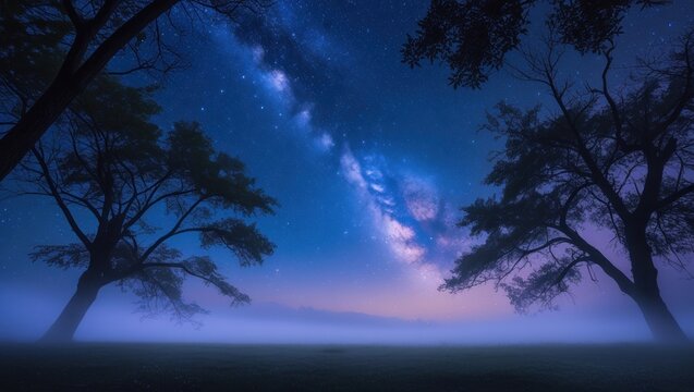 Silhouetted trees stand guard over a misty field under a night sky filled with the Milky Way.
