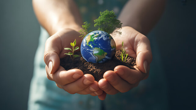 Persons cupped hands gently cradle a miniature Earth globe surrounded by green sprouts and small trees
