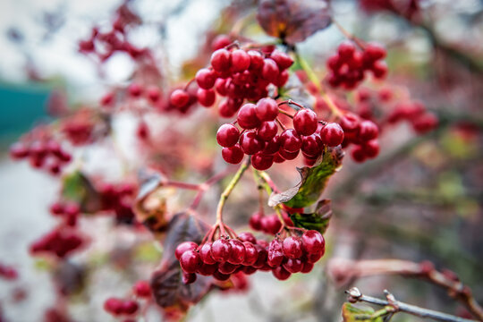 Close Up Of Beautiful Red Fruits Of Viburnum Vulgaris Guelder Rose Viburnum Opulus Berries And Leaves In The Summer Outdoors Red Viburnum Berries On A Branch In The Garden