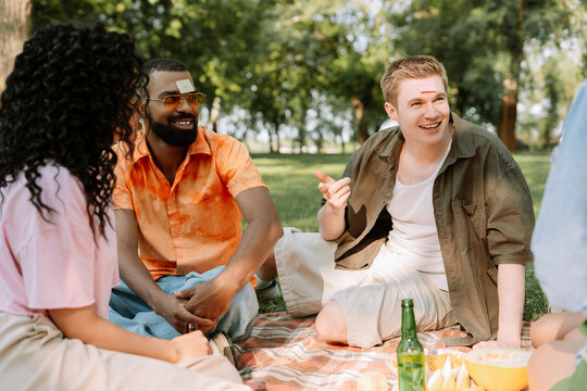 Guess who I am. Small children friends playing guessing game with sticky notes, brother and sister sitting on floor play together, two kids siblings enjoy spending time together during weekend at home