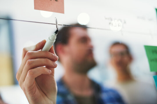 Glass, writing and sticky notes for ideas, hand and collaboration for brainstorming, creative and team. Office, people and event coordinator in business, planning and discussion for guest list