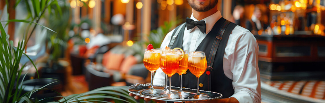 waiter hands stands ready to greet arriving guests with a tray of welcome drink