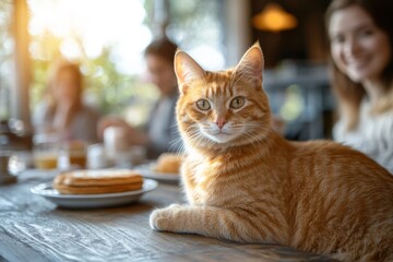 Orange cat relaxes at a cozy cafe while guests enjoy brunch in a sunlit atmosphere