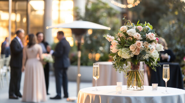 Elegant cocktail reception setup, tables with white linens and floral centerpieces, guests mingling with champagne glasses, warm ambient lighting