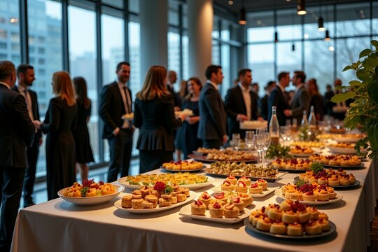Lively Indoor Reception with Abundant Pastries and Mingling Guests
