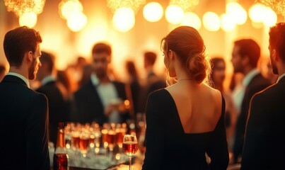 Evening celebration in an elegant venue with sparkling drinks and guests mingling in formal attire