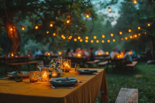 blurred summer background of a summer garden party, with tables set up with bright tablecloths, string lights hanging overhead, and guests mingling in the background. stock photo.rule of thirds .