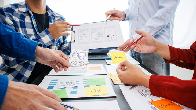 Close up ux developer and ui designer brainstorming about mobile app interface wireframe design on table with customer breif and color code at modern office.Creative digital development agency