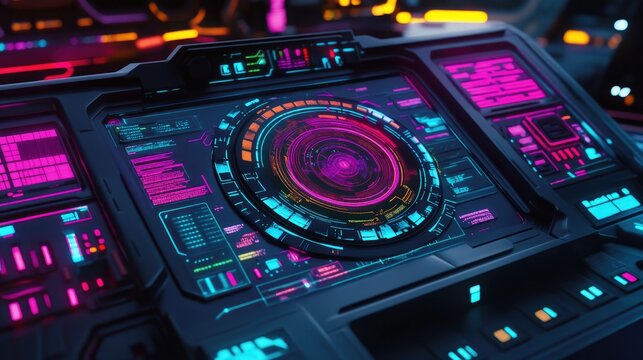 Futuristic control panel with vibrant neon displays and intricate digital interfaces
