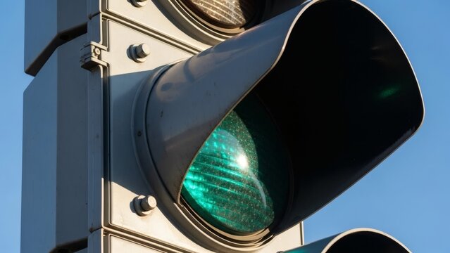 Vibrant green traffic light illuminated against a clear blue sky, symbolizing progress, safety, and permission to proceed at an urban intersection