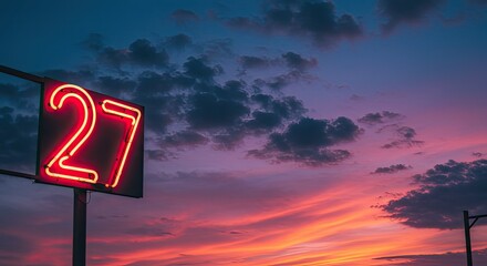 Vibrant neon number 27 sign glowing against a dramatic, colorful sunset sky with scattered clouds