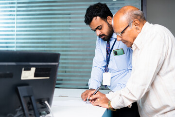 Focus on banker, Employee helping or guiding old man to fill receipt or to fill banking documents at desk - concept of client agreement, elderly support and banking customer service.