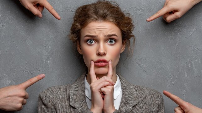 Anxious businesswoman and pointing hand in office environment