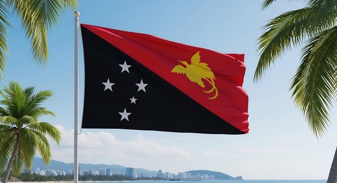 Vibrant Papua New Guinean Flag Framed by Palms on a Sunny Coast