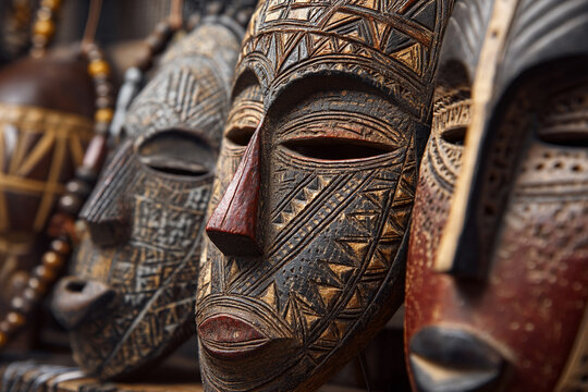 A close-up of Guinean handmade wooden masks, intricately carved with symbolic patterns, emphasizing local craftsmanship and spiritual art.