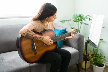 Hispanic woman learning how to play the guitar at home