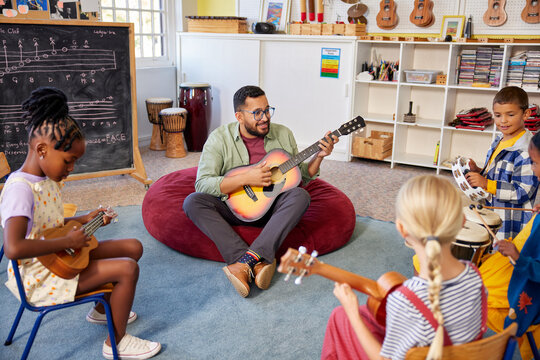 Music male teacher playing guitar in class