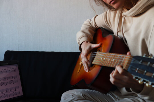 A girl is playing the guitar and watching notes on a laptop.