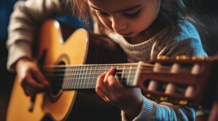 Cute little girl practicing her guitar lessons at home