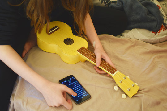 Teen girl tuning yellow soprano ukulele guitar by using application on smartphone while sitting in bed in her room at home indoors. Music instruments and hobbies concept.
